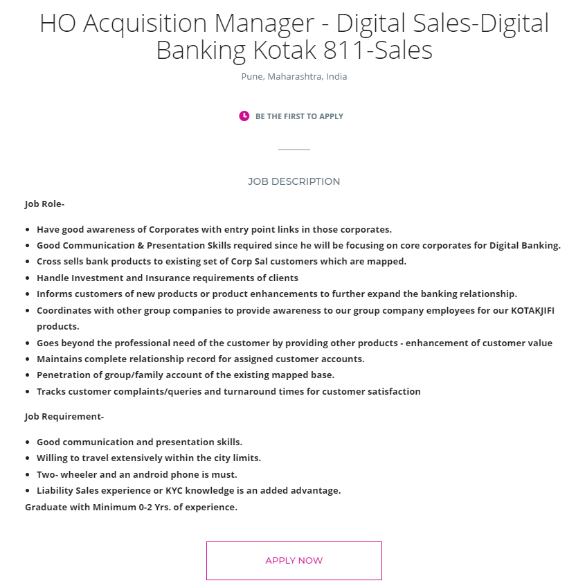 आपको बता दूं दोस्तों की , Kotak Mahindra Bank के जितने भी हाई लेवल के जॉब होते हैं। उन्हे अक्सर बैंक के करियर वेबसाइट पर पब्लिश किया जाता है।