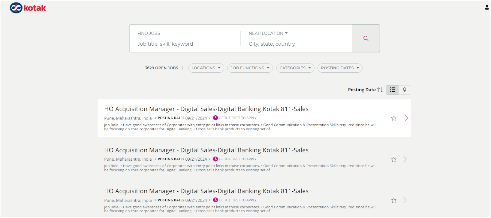 यहां नीचे आप Kotak Mahindra Bank के ऑफिशियल करियर वेबसाइट का स्क्रीनशॉट के देख सकते है ।