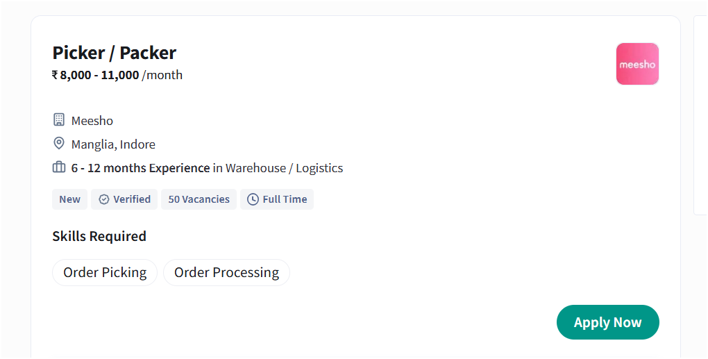 Meesho Warehouse Packing Job – नमस्कार दोस्तों अगर आप 12 वी पास हैं , तो मीशो कंपनी आपके लिए Picker तथा Packer की भर्ती निकली हैं।